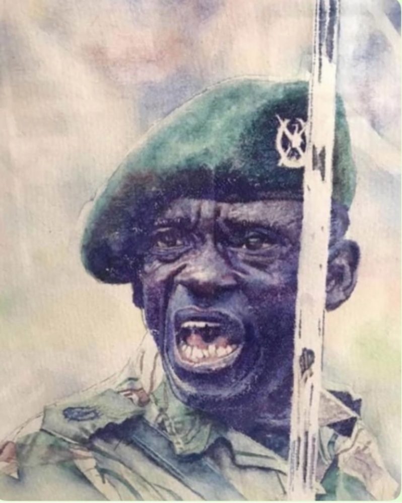 Nyasha Bandama COUNTRY: Zimbabwe ARTWORK MEDIUM: Watercolor PAINT LIST: Ultramarine Alizarin Olive Green Payne’s grey ARTWORK SIZE: 39cmx27cm DETAILS: The army commander/ general often takes Centre stage in African politics, barking instructions from behind the scenes.