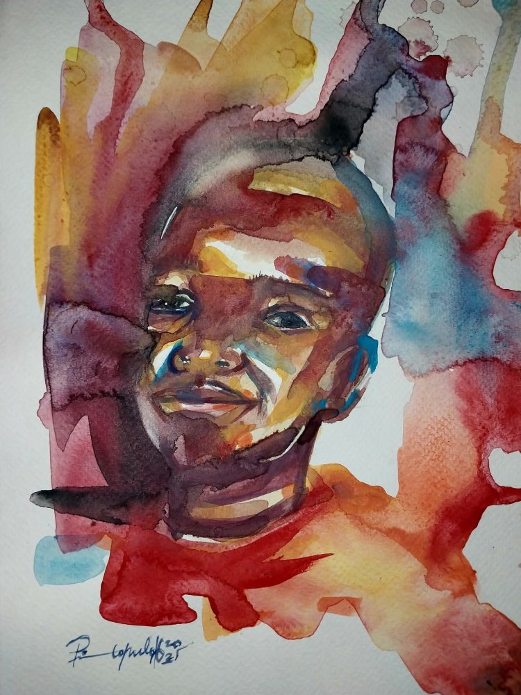 Pinto Zulo COUNTRY: Mozambique ARTWORK MEDIUM: Watercolor PAINT LIST: Cobalt Blue Yellow Ochre Burnt Umber Vermillion ARTWORK SIZE: 76 x 61cm