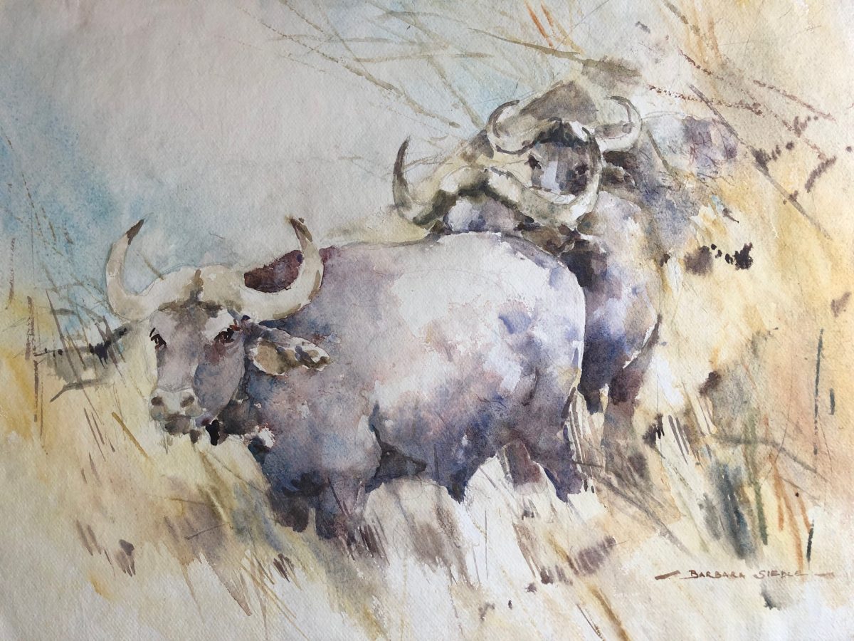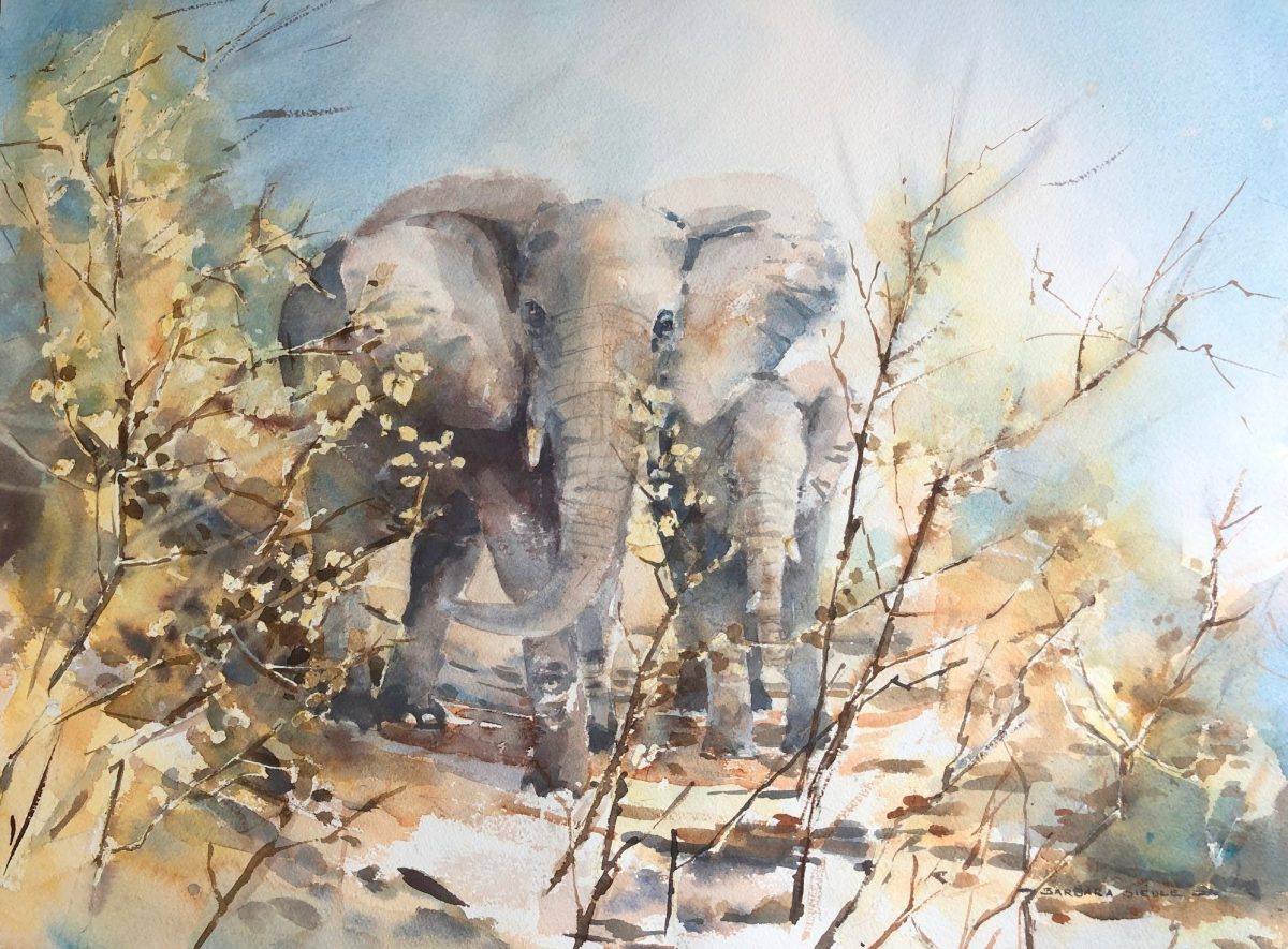 Barbara Siedle COUNTRY: South Africa ARTWORK MEDIUM: Watercolor PAINT LIST: Cerulean Blue, Yellow Ochre, French Ultramarine, Indian Red ARTWORK SIZE: 51 x66