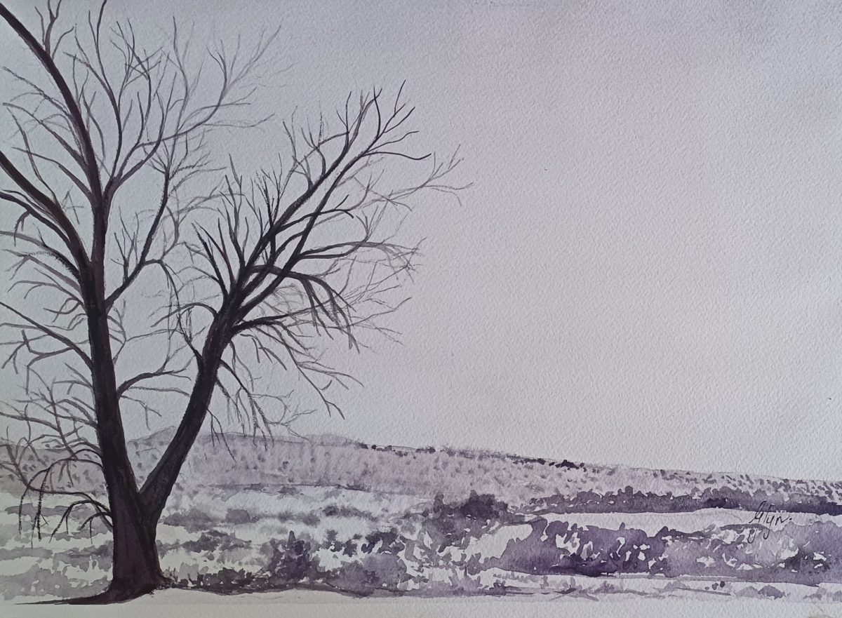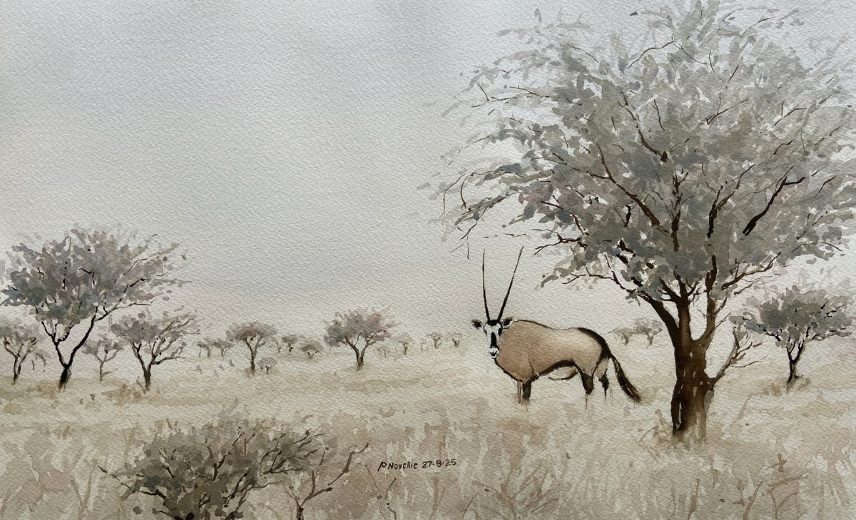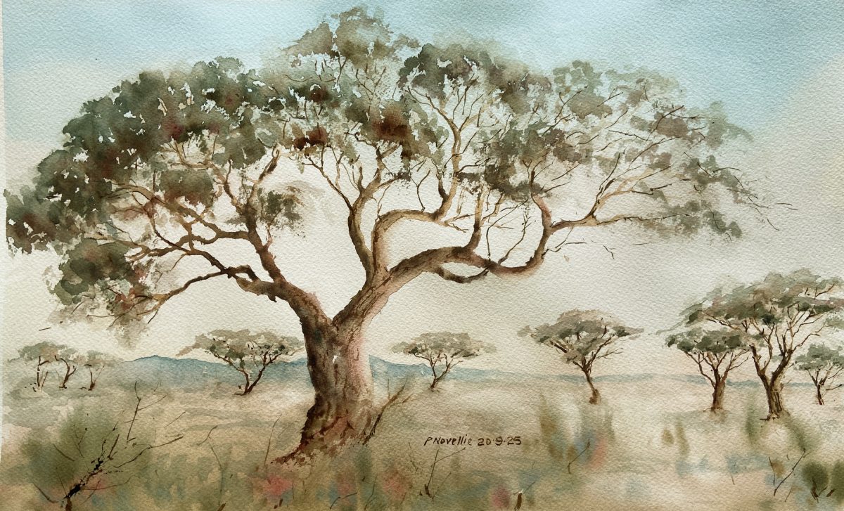 Peter Novellie COUNTRY: South Africa ARTWORK MEDIUM: Watercolor PAINT LIST: Cerulean blue Burnt umber Permanent rose ARTWORK SIZE: 25 cm by 35 cm DETAILS: Composed from photos taken during a recent visit to Mokala National Park.