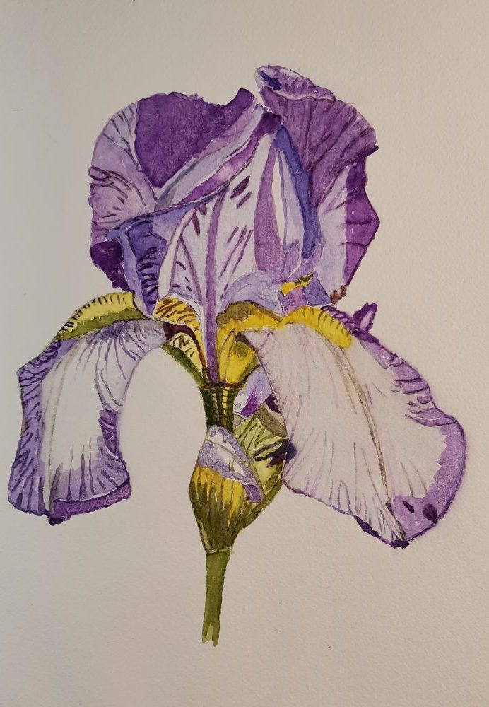 Guillaumé v Jaarsveld COUNTRY: South Africa ARTWORK MEDIUM: Watercolor PAINT LIST: Gold Quinacudone Olive green Ultramarine Violet Maniganese Voilet ARTWORK SIZE: H 34cm x 24cmW DETAILS: Bearded Iris blooms like a Crown of the garden. Stand proudly in full display. Used Arches 300gm rough.
