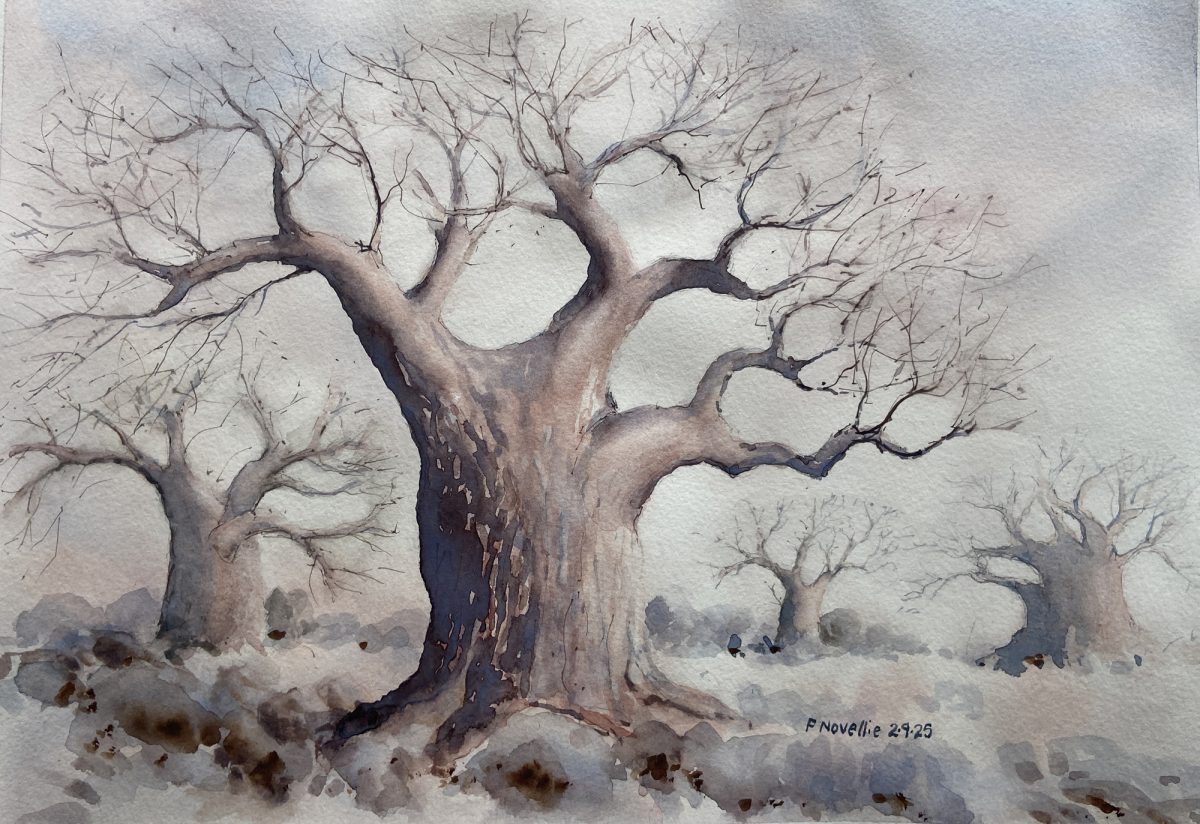 Peter Novellie COUNTRY: South Africa ARTWORK MEDIUM: Watercolor PAINT LIST: Burnt umber Permanent rose Cobalt blue ARTWORK SIZE: 25 cm by 35 cm DETAILS: From the imagination, guided by photos of different baobabs.