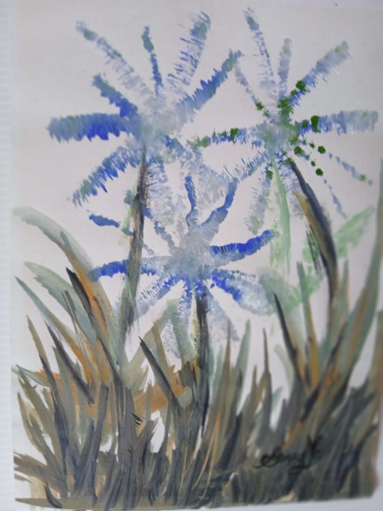 McClelland Gene COUNTRY: South Africa ARTWORK MEDIUM: Watercolor PAINT LIST: Cerulean Blue Olive Green Bronze Yellow Neutral Gray ARTWORK SIZE: H 26.7cm W14.58cm DETAILS: Medium watercolor on cream white card Fantasy Flowers