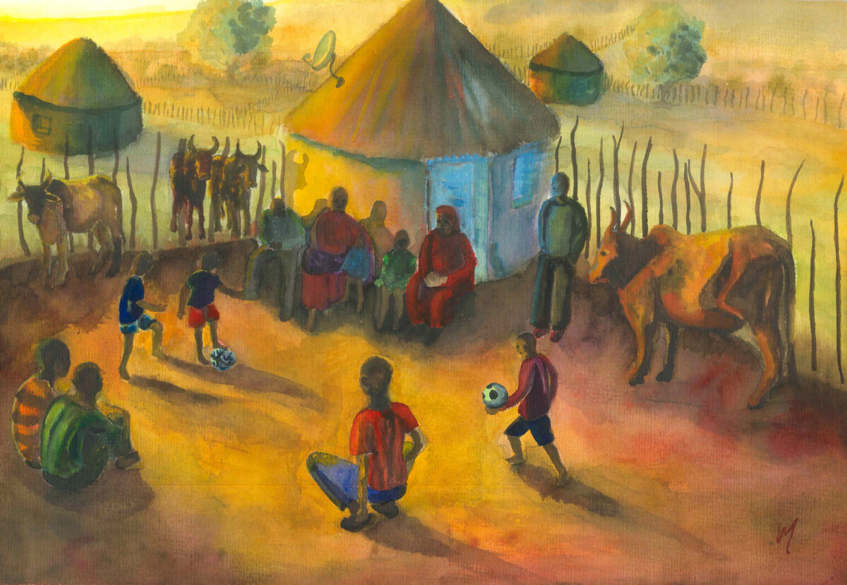 Heritage and Horizons portrays the vibrant rhythm of rural South African life. At dusk, children play soccer near traditional huts, while family and friends watch with compassion. Nguni cattle linger nearby, grounding the scene in heritage.