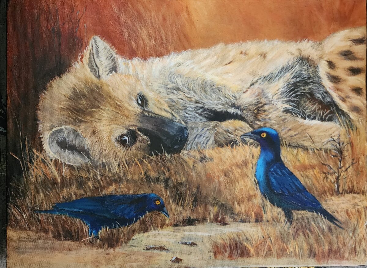 MSpotted Hyena and glossy starling. A photo I took whilst traveling in the Kruger National Park.