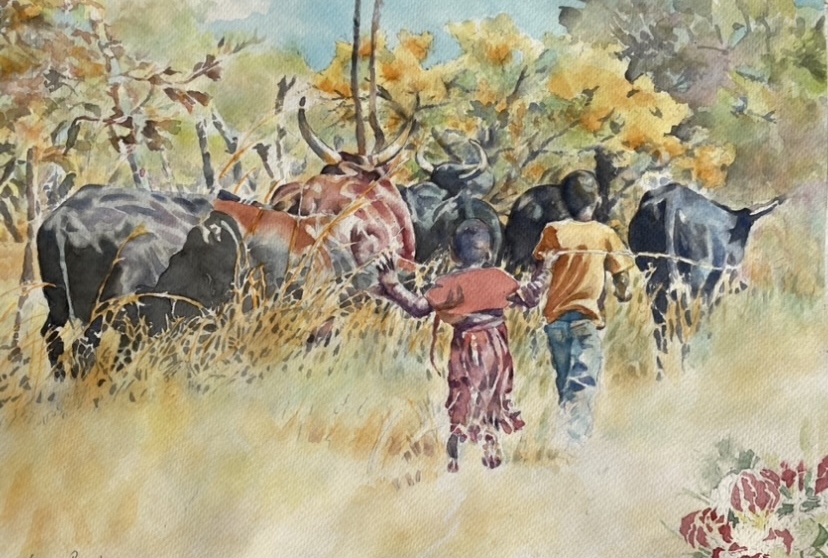 Little Children , a brother and sister herding back cattle after grazing home from the wilderness