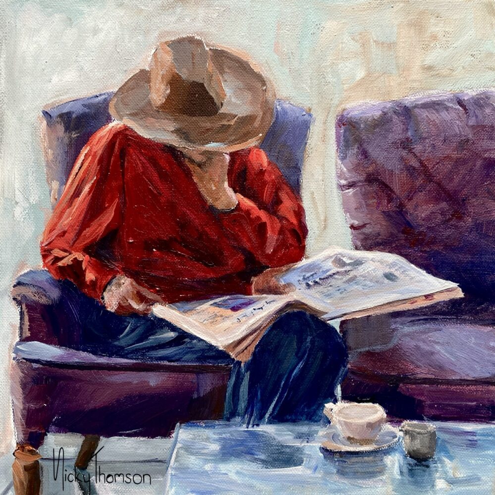 While at a coffee shop, I found myself captivated by an elderly man engrossed in his newspaper. The way the sunlight filtered through the window, creating a soft radiance around him and highlighting his red shirt, was enchanting. I opted for a limited colour palette and bold loose brushwork to capture his essence in my artwork.