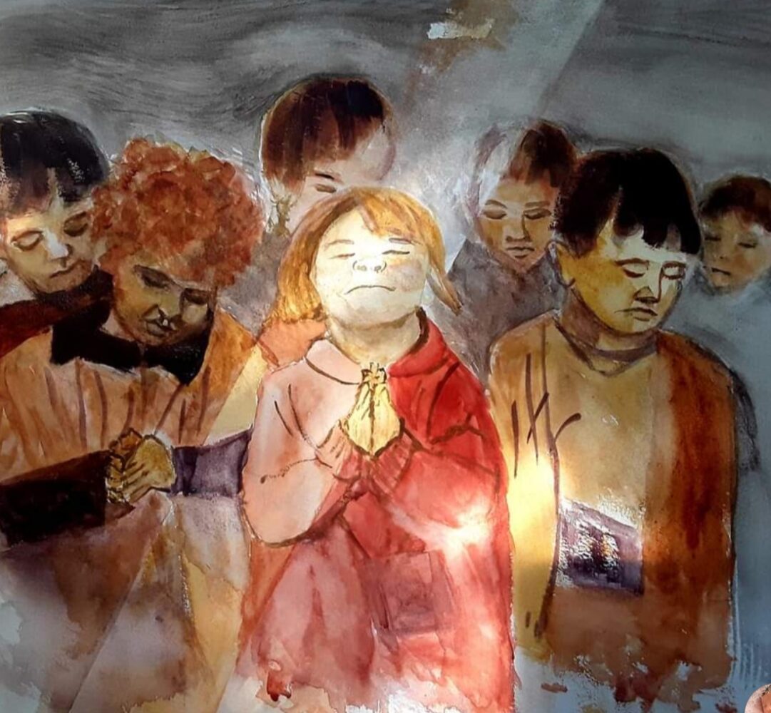 My theme for this painting is reflecting back on life as a child we used to say morning prayers before school started dont know if this happens anymore. We used to pray for peace,health and prosperity doesnt seem like it worked on the peace side. The reference was from an old black and white photo of kids in the Gorbals of Glasgow my home town photographer and children unknown
