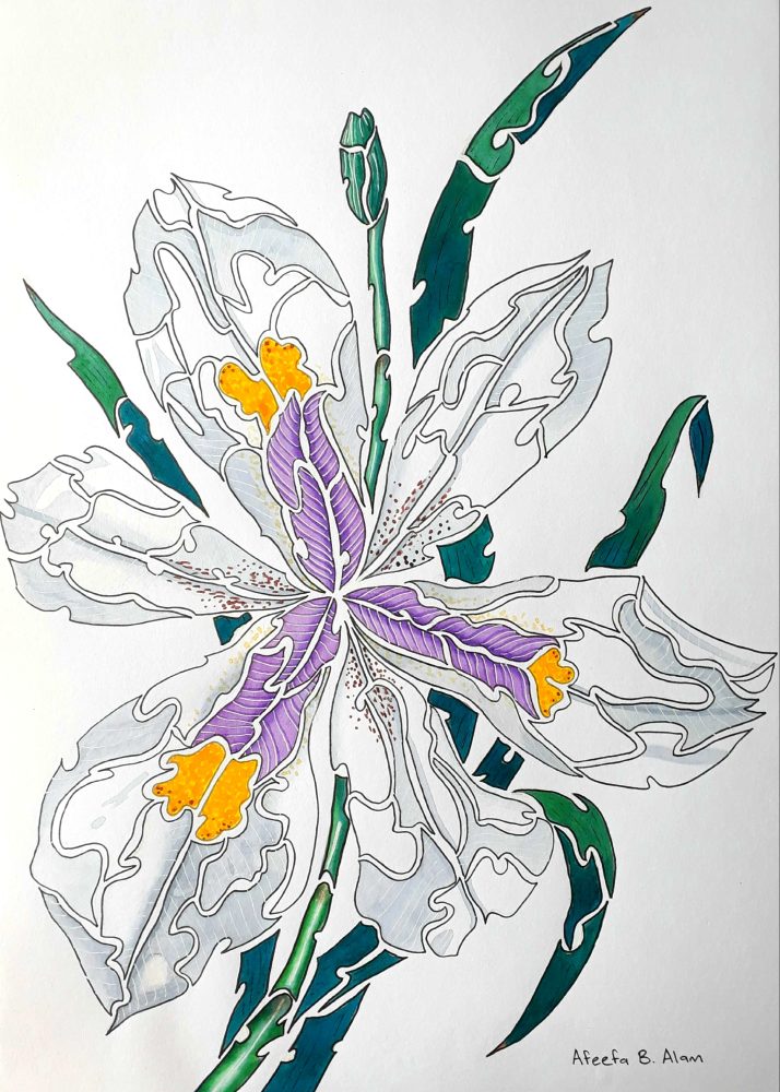 Afeefa Alam COUNTRY: South Africa ARTWORK MEDIUM: Ink PAINT LIST: Viridian Black Voilet Process yellow Titanium White ARTWORK SIZE: 42cm x 29.7cm DETAILS: Dala acrylic ink on Fabriano ecological 200gms paper. Ink pen outline in black. Painted in acrylic ink. White ink pen details.