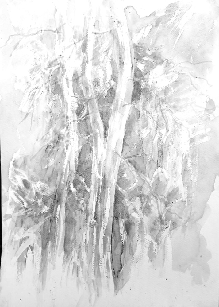 Brian Eriksson COUNTRY: South Africa ARTWORK MEDIUM: Watercolor PAINT LIST: Viridian green Pthalo blue Scarlet lake Cadmium yellow ARTWORK SIZE: 29cm x 42cm DETAILS: A lotus pond in morning light in a forest of bamboo huts where I lived quietly for two years during COVID.