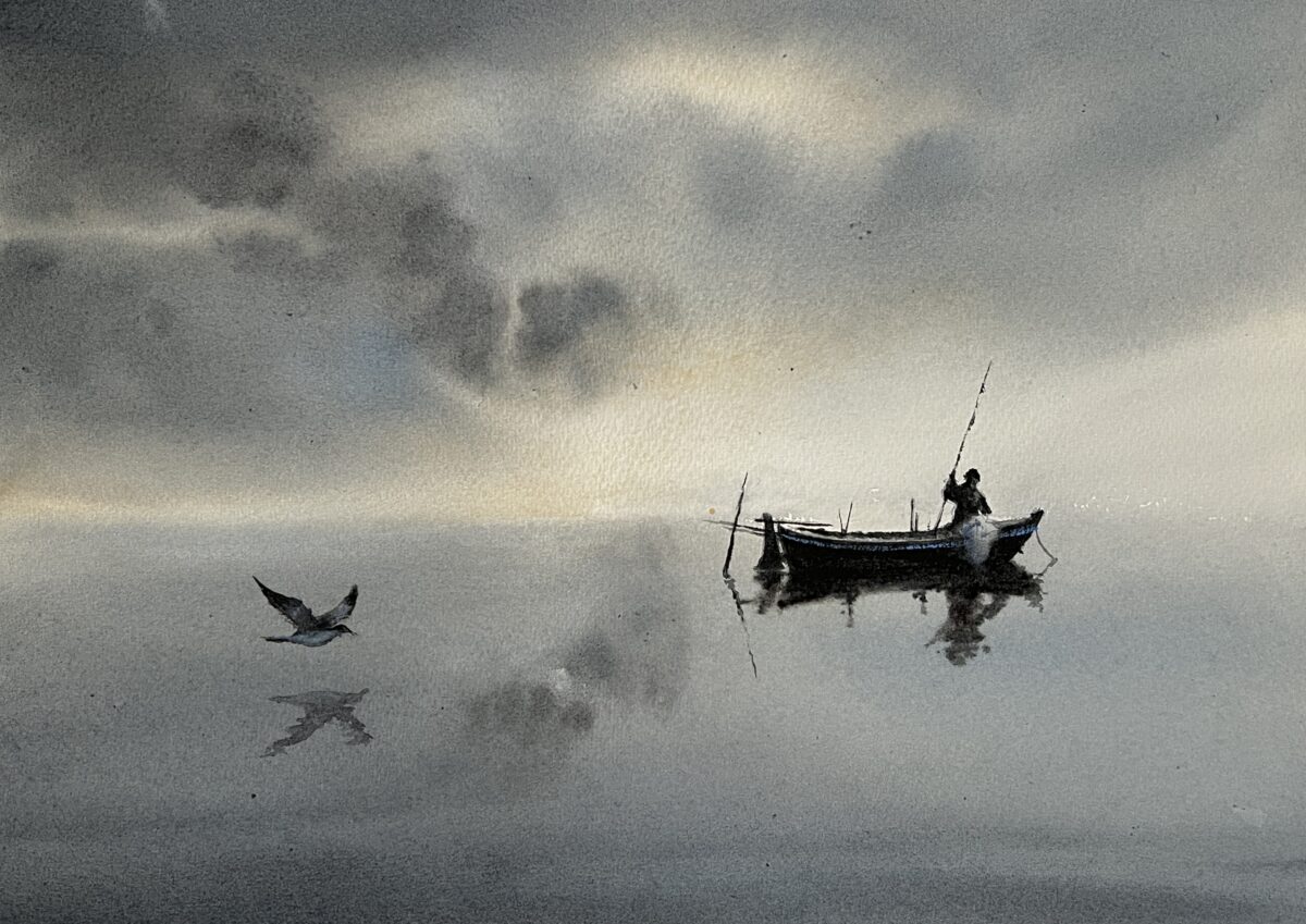 Jan Min COUNTRY: Netherlands ARTWORK MEDIUM: Watercolor ARTWORK SIZE: 28 x 38 cm DETAILS: A misty Morning …and suddenly the seagull is there…..