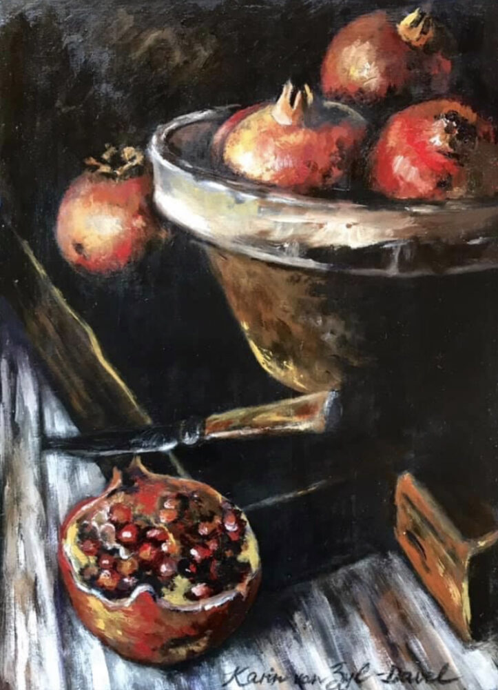 Karin Davel COUNTRY: South Africa ARTWORK MEDIUM: Acrylic ARTWORK SIZE: 30 x 20cm DETAILS: Warmth – Capturing light on a pomegranate still-life – done in acrylic on board
