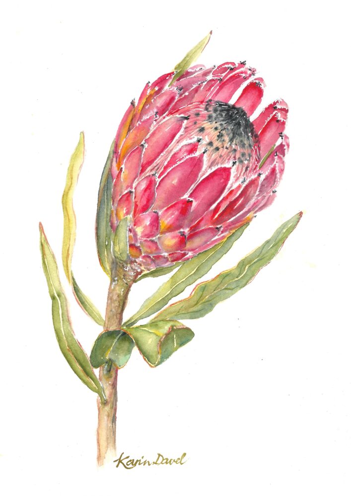 Karin Davel COUNTRY: South Africa ARTWORK MEDIUM: Watercolor ARTWORK SIZE: 30 x 20cm DETAILS: A botanical study of a single stem of the Protea Pink Ice Watercolour on paper.