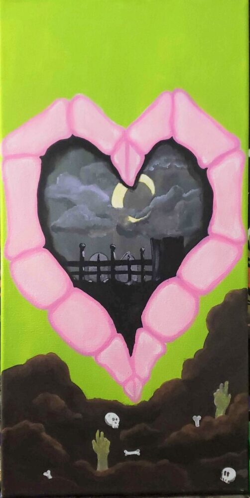 Kirstan Bilderback COUNTRY: United States ARTWORK MEDIUM: Acrylic ARTWORK SIZE: 20"x10" DETAILS: Inspired by a night time stroll with a loved one through the cemetary and the unknown beneath them.