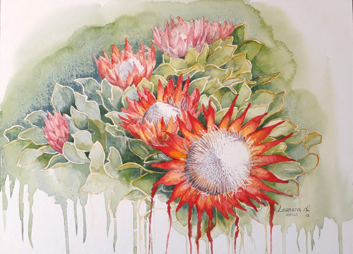 Leonora de Lange COUNTRY: South Africa ARTWORK MEDIUM: Watercolor PAINT LIST: King proteas and their leaves with dribbles. The protea is a symbol of rejuvination, so the dribbles represent getting rid of the old and rejuvinating the new. ARTWORK SIZE: 30 x 40 cm