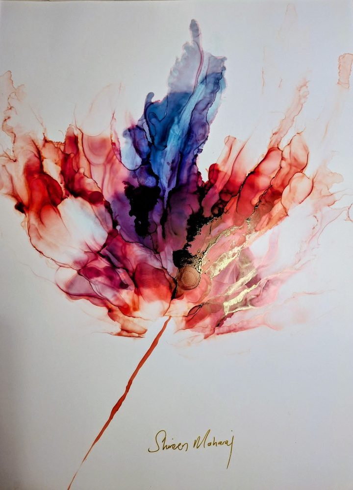 Shireen Maharaj COUNTRY: South Africa ARTWORK MEDIUM: Ink PAINT LIST: Ink colours Ultra Marine Blue Magenta , Mandarin, Citrus ARTWORK SIZE: 28 x 18 DETAILS: I used alcohol together with the ink to create movement and tonal value. This painting looks like a flower doing a dance as its spreads its wings to fly away.