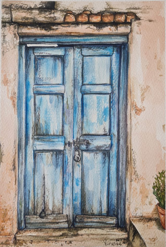Varuska Denysschen COUNTRY: South Africa ARTWORK MEDIUM: Watercolor PAINT LIST: Permanent red-Mungyo Yellow – Mungyo Cerulean Blue – Mungyo Paynes Grey- Daniel Smith ARTWORK SIZE: 27 x 38cm DETAILS: Once a point of entry, opportunity and protection now stand a silent witness to decay and change. Memories made and perhaps forgotten.
