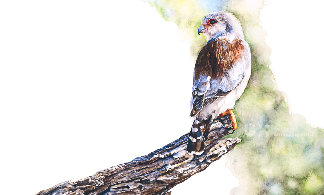 Corinne Erasmus COUNTRY: South Africa ARTWORK MEDIUM: Watercolor ARTWORK SIZE: 23.5 x 39cm DETAILS: Pygmy Falcon
