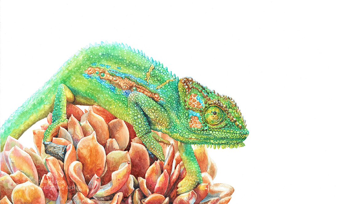 Corinne Erasmus COUNTRY: South Africa ARTWORK MEDIUM: Watercolor ARTWORK SIZE: 23.5 x 39cm DETAILS: Cape Dwarf Chameleon. Title meaning: In Afrikaans, a chameleon is called a ‘trapsuutjie’, which translates to ‘tread lightly’. The title is a play on words!