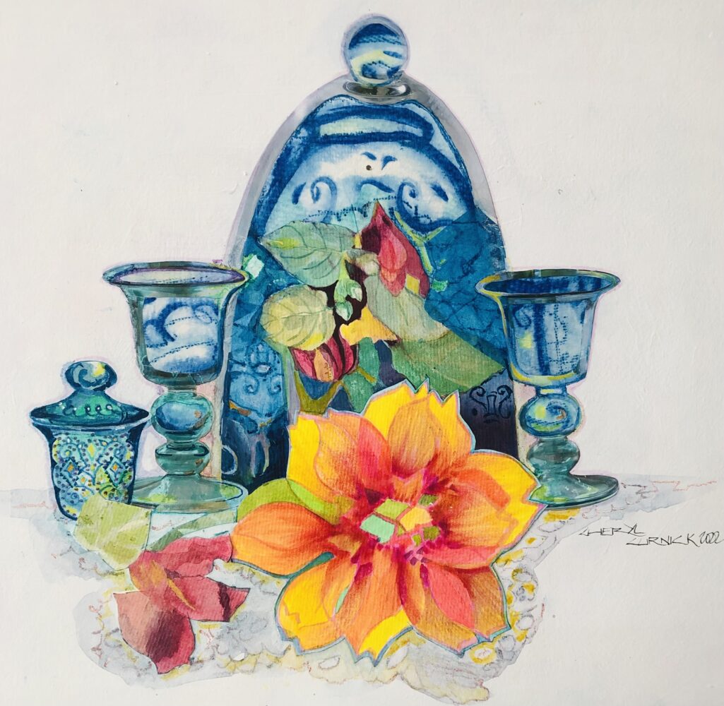 Watercolor /Collage/on Crescent Board..inspired by love of Blue Glass